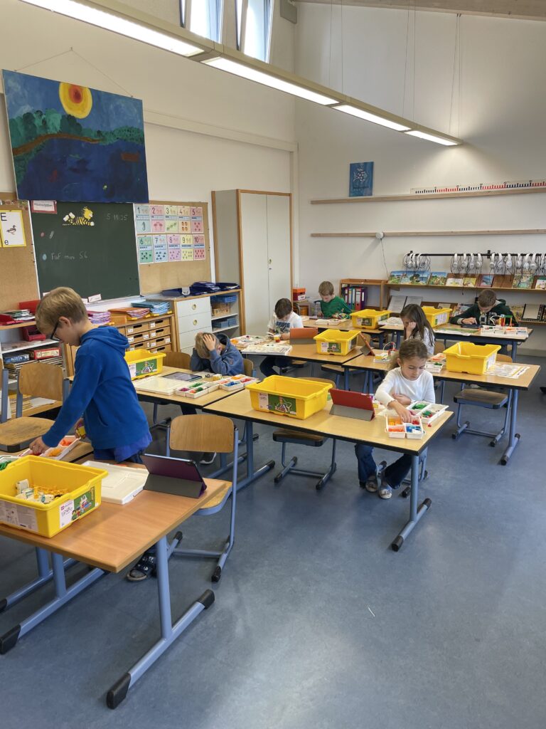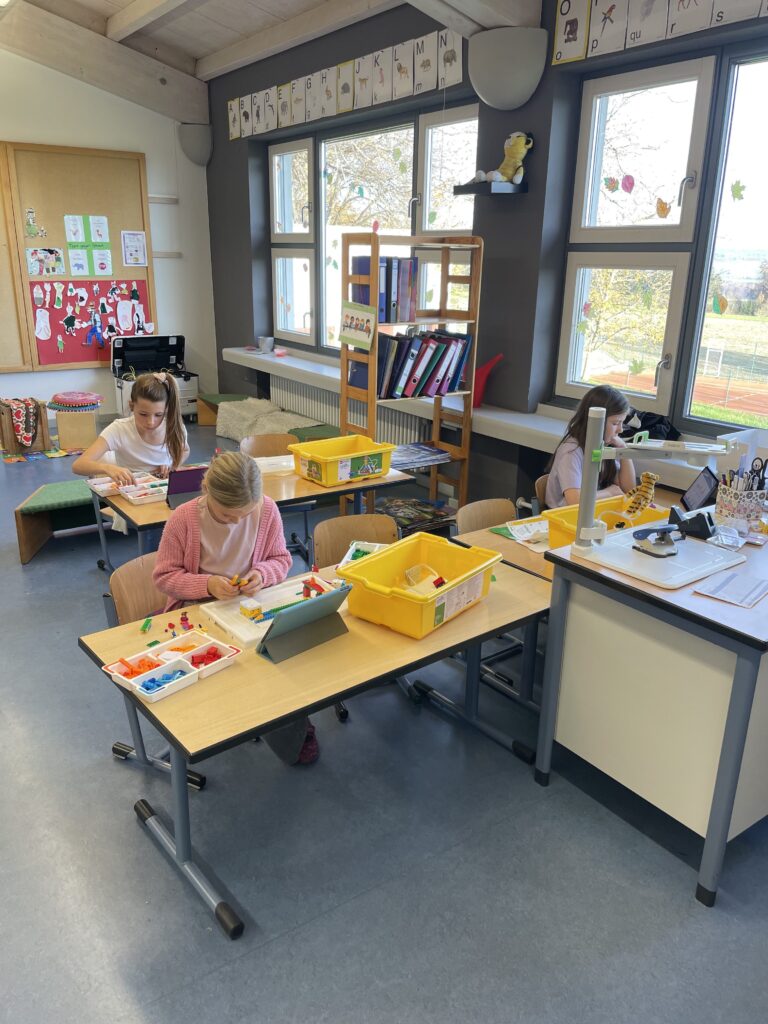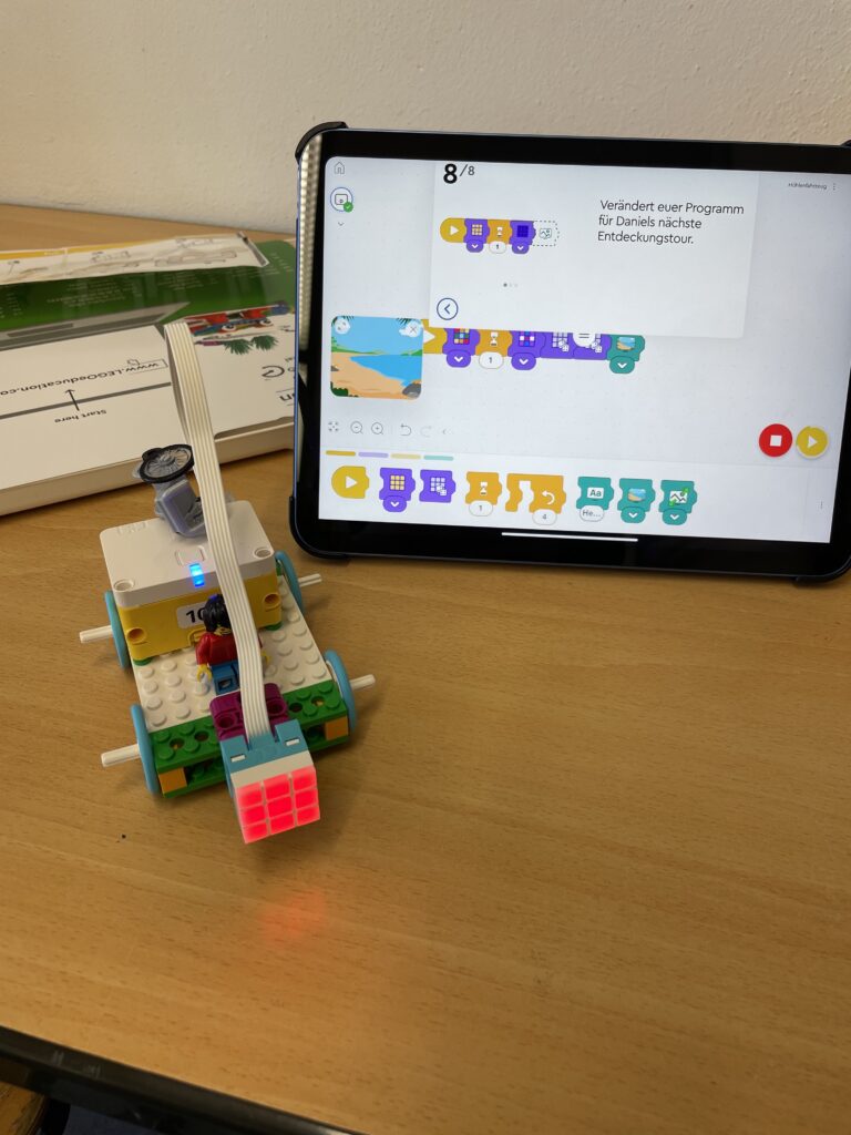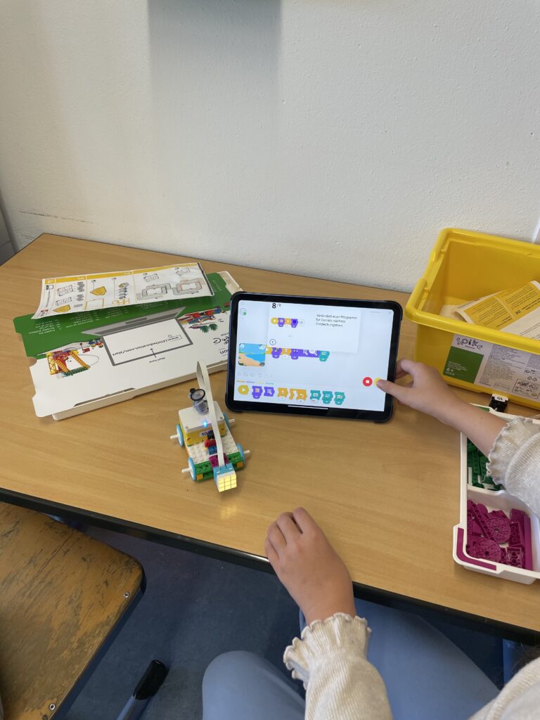 In diesem Schuljahr können wir für die Kinder der dritten und vierten Schuljahre eine Robotik – AG anbieten. Das Landesmedienzentrum Baden-Württemberg hat uns LEGO-Spike Kästen gesponsert. So konnten wir voll motiviert starten. Die erforderliche Programmierung findet auf den Tablets statt. Mittlerweile haben die Kinder gelernt, wie die Tablets mit ihren gebauten Sachen und den Hubs verbunden werden, so dass sie nun ihre Fahrgeschäfte steuern können. Mit der Hilfe von Lichtschranken oder anderen Startsignalen gab es einen kleinen „Rummelplatz“. Kleine Karussells, Musik, Burger-Bring-Maschinen oder andere Fahrzeuge bereicherten das Klassenzimmer. Die Kinder sind mit Feuereifer dabei : -)