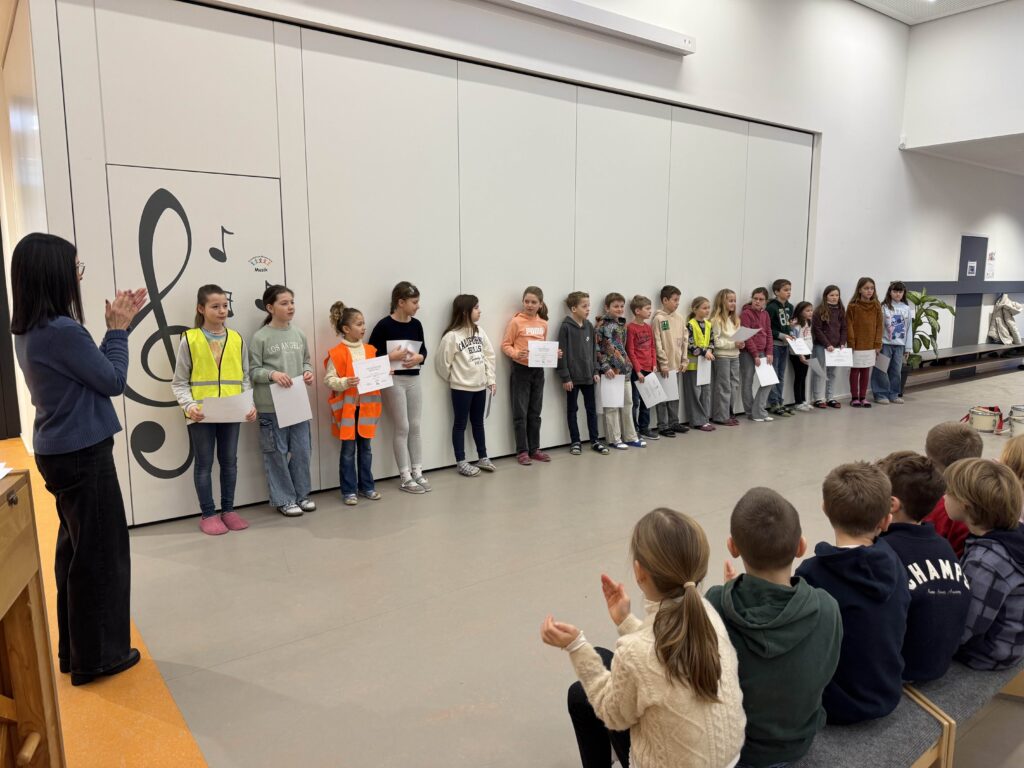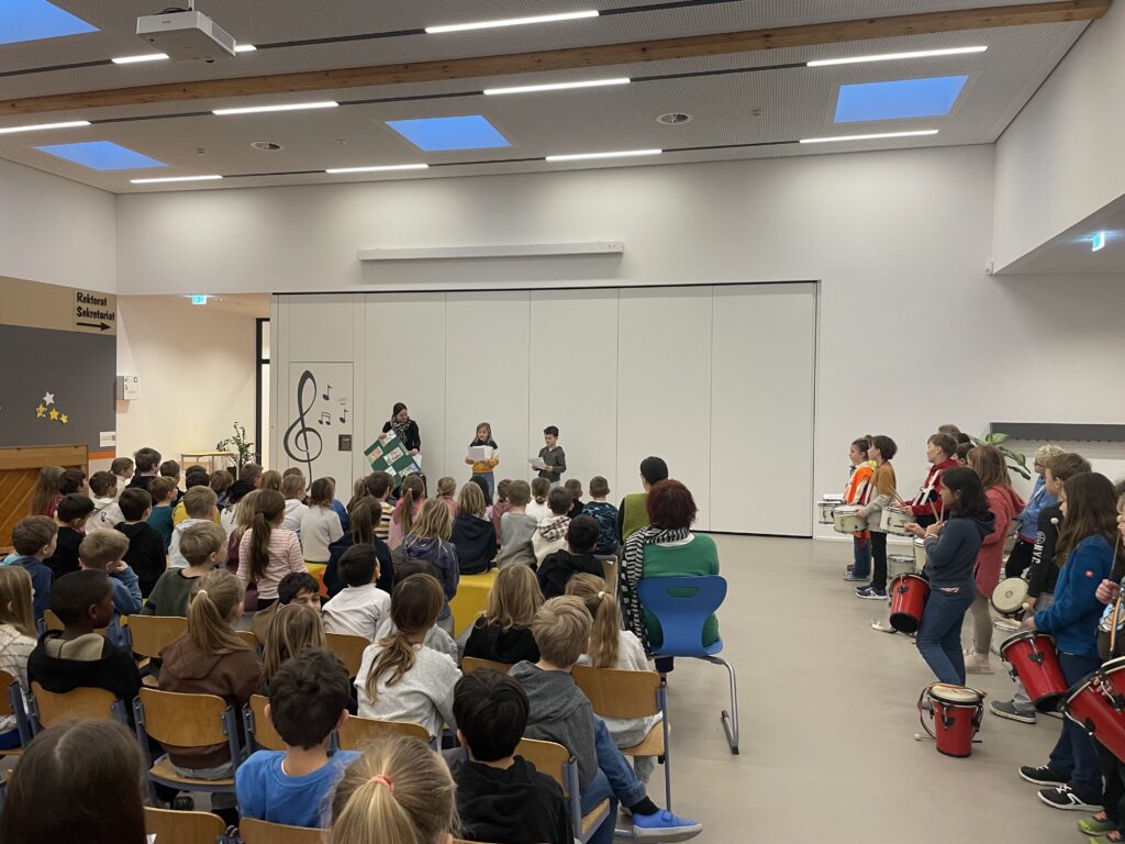 Nachdem die Kinder den Nikolaus und seinen Knecht Ruprecht begrüßt haben, konnten zwei Kinder mit der Flöte und der Gitarre den Nikolaus und alle Schulkinder auf diesen schönen Tag einstimmen.